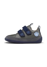 Chaussures violettes claires et beiges avec deux bandes velcro réglables ; semelle en caoutchouc souple avec bout arrondi ; portées avec un pantalon en denim à rayures claires.