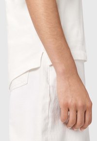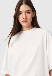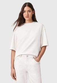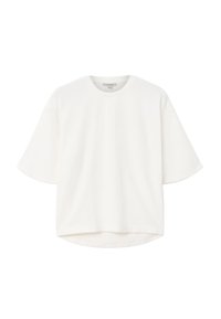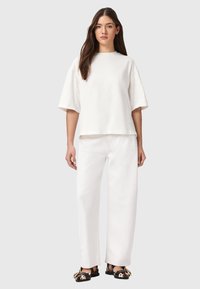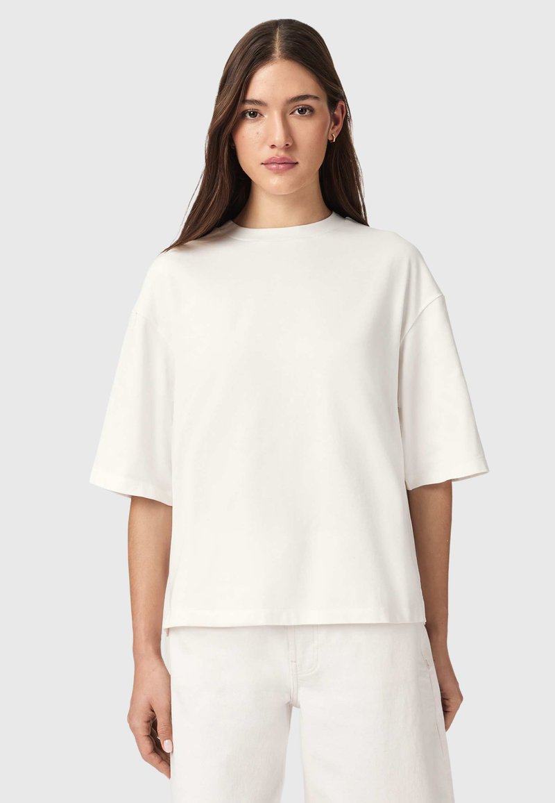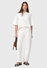 T-shirt blanc surdimensionné en tissu lisse. Manches courtes, encolure ronde et coupe décontractée. Associé à un pantalon blanc.