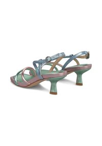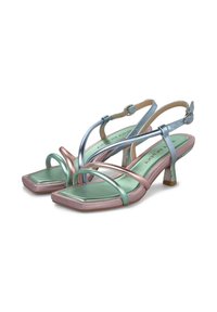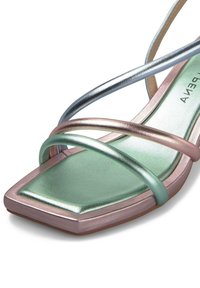 Pieds dans des talons ouverts à lanières métalliques pastel avec des bouts carrés, portant un pantalon large texturé violet clair sur un fond blanc.