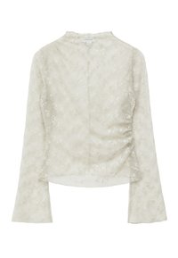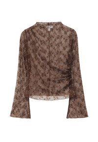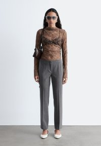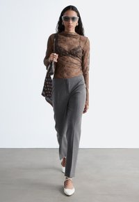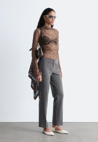 Femme portant un haut marron fleuri transparent sur un soutien-gorge noir, un pantalon gris, des lunettes de soleil transparentes, tenant un sac à main noir avec une écharpe marron à motifs.