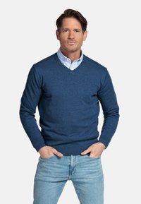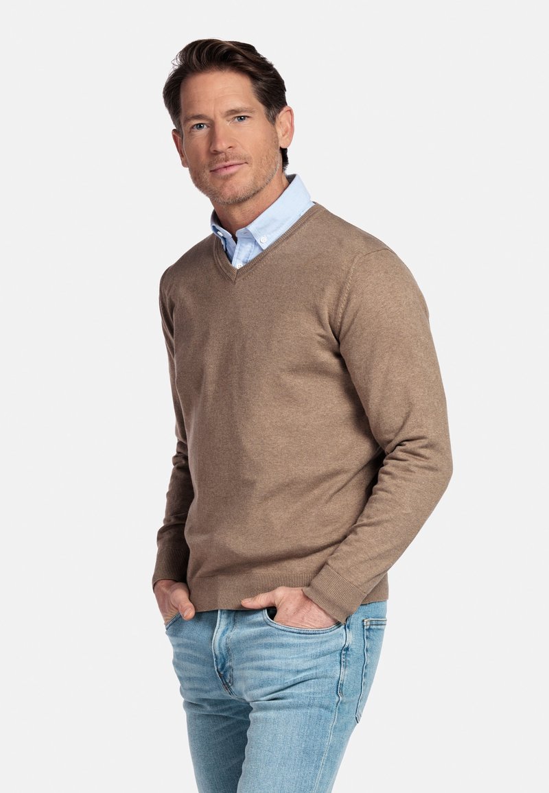 Homme portant une chemise bleu clair à col sous un pull marron à col en V, les mains dans les poches d'un jean bleu clair, debout devant un fond blanc.