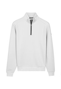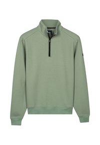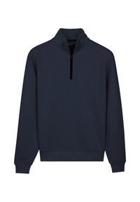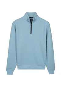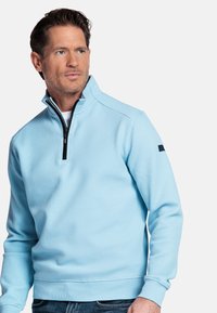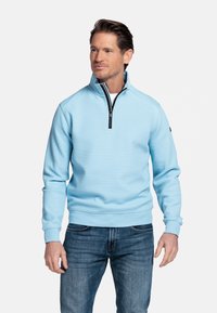 Homme portant un pull à fermeture éclair courte bleu clair et un jean bleu, debout les bras détendus, regardant légèrement sur le côté sur un fond blanc.