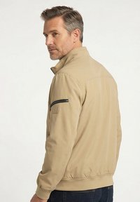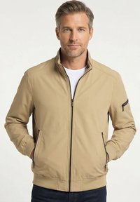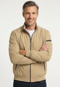 Homme souriant aux cheveux gris portant une veste beige zippée et une chemise blanche, debout les bras croisés devant un fond uni.