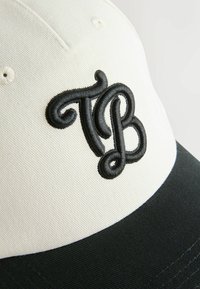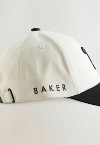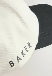 Casquette de baseball blanche et noire avec "TB" brodé sur le devant et "BAKER" imprimé sur le côté, sur fond blanc.