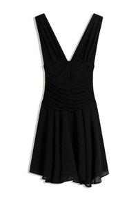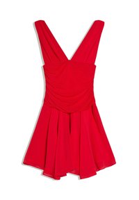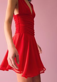 Jeune femme aux longs cheveux foncés portant une robe rouge sans manches à décolleté profond, debout devant un fond rose.
