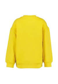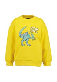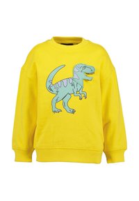 Sweat-shirt en coton jaune avec un imprimé dinosaure turquoise, agrémenté d'accents violets. Le design est simple avec un col rond et des poignets côtelés.