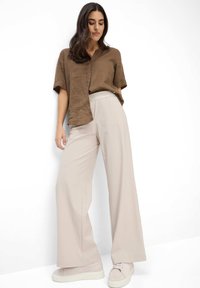 Pantalon beige à jambes larges porté avec des baskets rose clair et une chemise marron à manches courtes, debout sur un fond blanc.