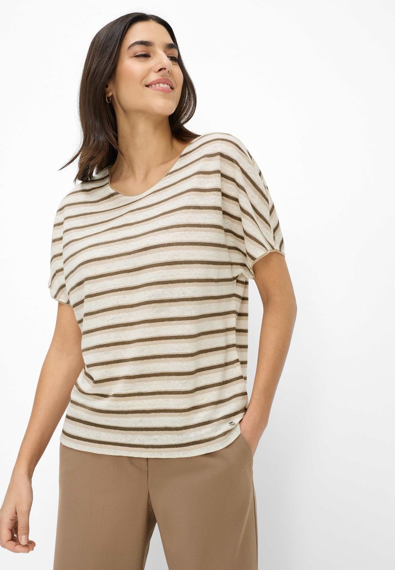 Femme portant un haut à manches courtes à rayures beige et marron et un pantalon marron clair, debout avec une main dans la poche, sur fond blanc.