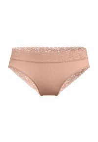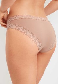 Culotte de bikini nude en tissu extensible et lisse. Dotée d'une ceinture en dentelle avec des motifs floraux. Design minimaliste avec une coupe classique.