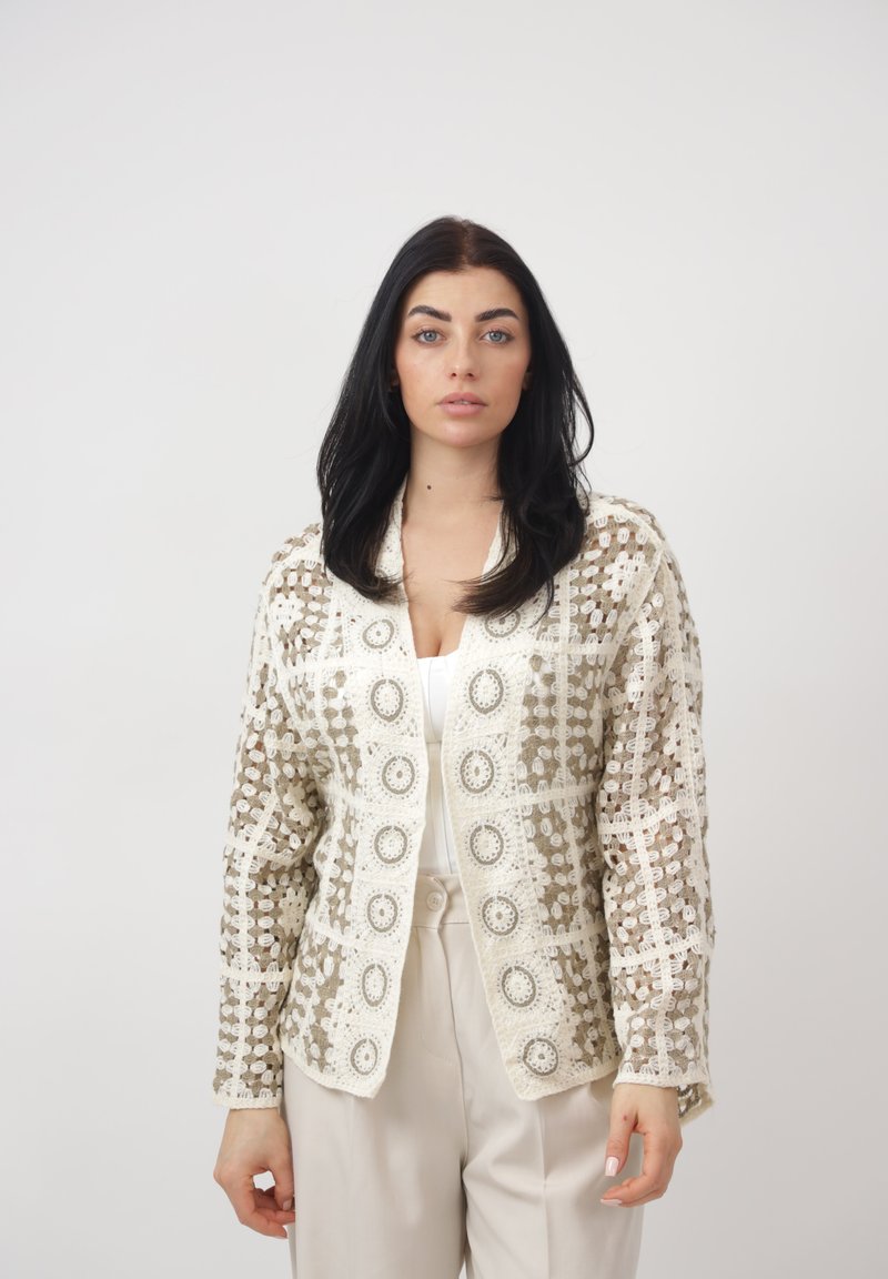 Femme aux longs cheveux foncés portant un cardigan beige à motifs crochetés sur un haut blanc et un pantalon taille haute clair, debout devant un fond uni.