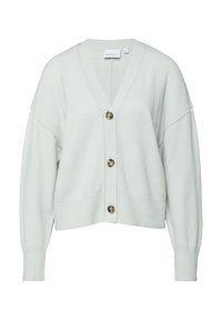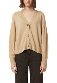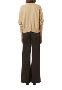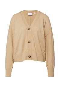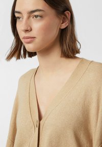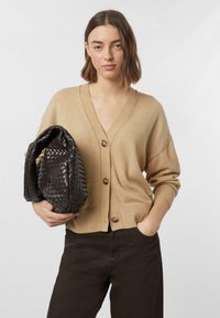 Femme portant un cardigan beige boutonné et un pantalon foncé, tenant une grande pochette en cuir tressé noire sur fond blanc.