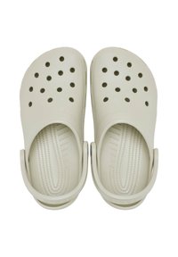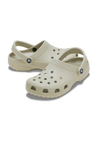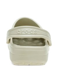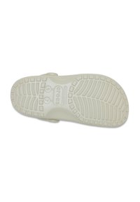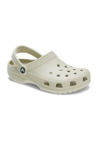 Sabot beige clair à enfiler avec trous d'aération, bride ajustable au talon, semelle intermédiaire texturée et logo rond sur le bouton de la bride.