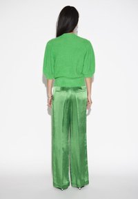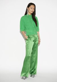 Cardigan vert pelucheux avec un col rond et des manches courtes bouffantes, associé à un pantalon en satin vert brillant. Fermeture à boutons simple.