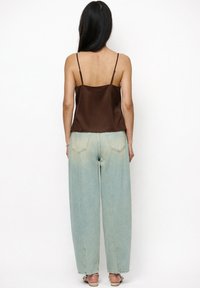 Femme portant un caraco marron orné de dentelle, un jean large bleu clair avec des bandes latérales effilochées, et des ballerines beiges à pointes cloutées, debout devant un fond blanc.