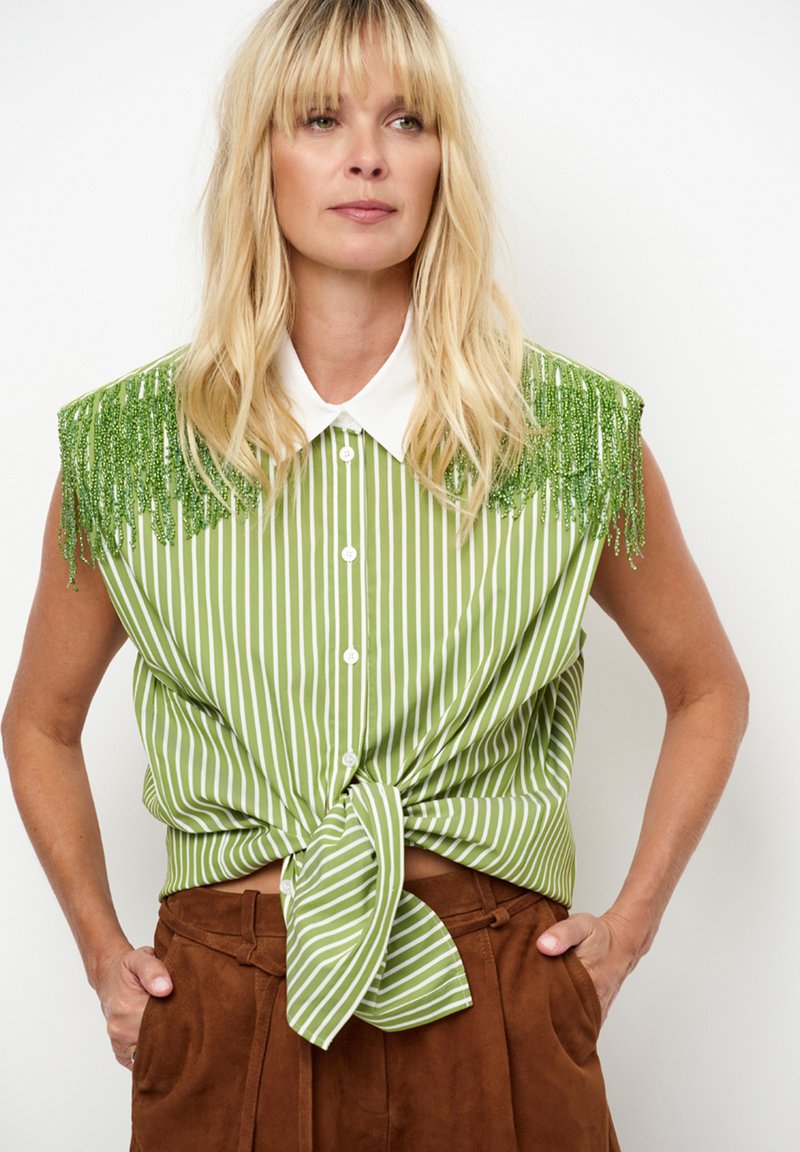 Chemise rayée verte avec détail à franges sur les épaules, col à boutons. Nouée à la taille, associée à un pantalon marron taille haute.