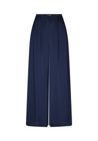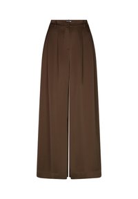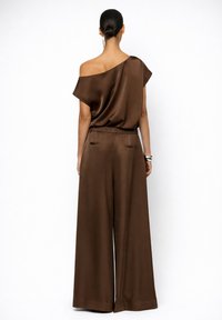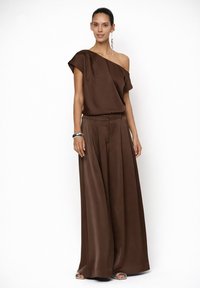 Femme portant un pantalon en satin marron à jambes larges et un haut assorti à une épaule, accessoirisée avec une grande boucle d'oreille et un bracelet argenté, posant devant un fond blanc.