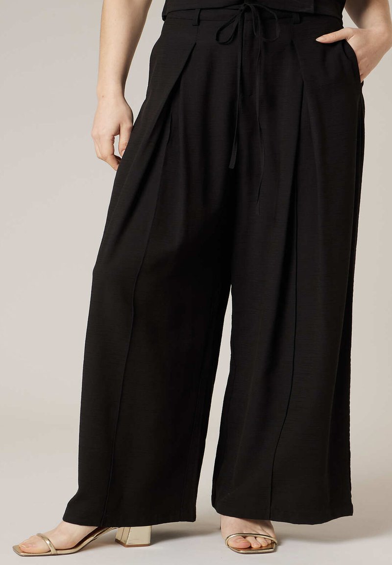 Pantalon noir à jambes larges avec plis devant, porté avec des sandales à talons blocs ouverts dorées, mains reposant dans les poches et le long du corps.