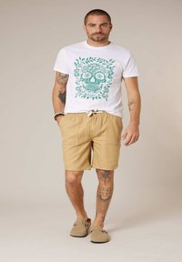 Homme portant un short beige avec cordon de serrage, des chaussures beige à enfiler, un t-shirt blanc avec un motif vert, et des tatouages visibles sur les jambes et les bras, debout sur un fond clair.