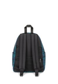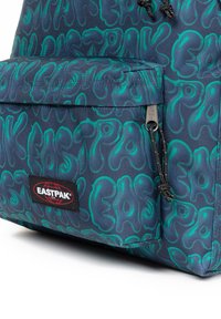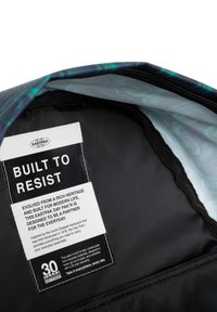 Sac à dos avec un fond bleu marine et un motif abstrait vert, fabriqué en tissu résistant, avec une poche avant et une poignée supérieure pour un transport facile.