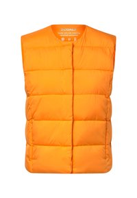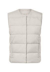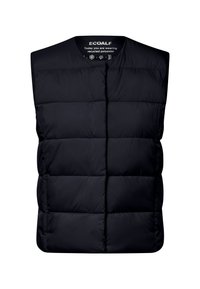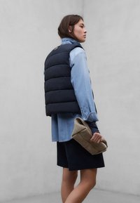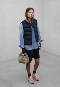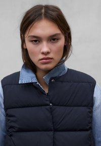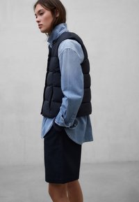 Jeune personne au regard sérieux portant un gilet matelassé bleu marine sur une chemise en denim bleu clair et un short noir, debout devant un fond gris uni.