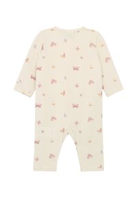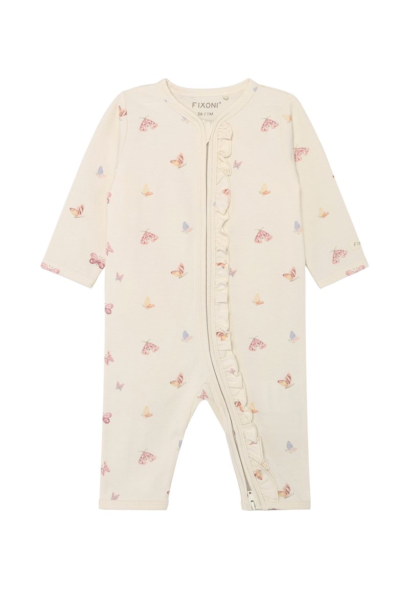 Barboteuse bébé de couleur crème avec imprimés de papillons roses et jaunes, fermeture éclair à l'avant et détail à volants le long de la ligne de la fermeture éclair.