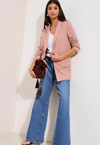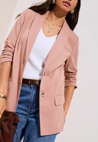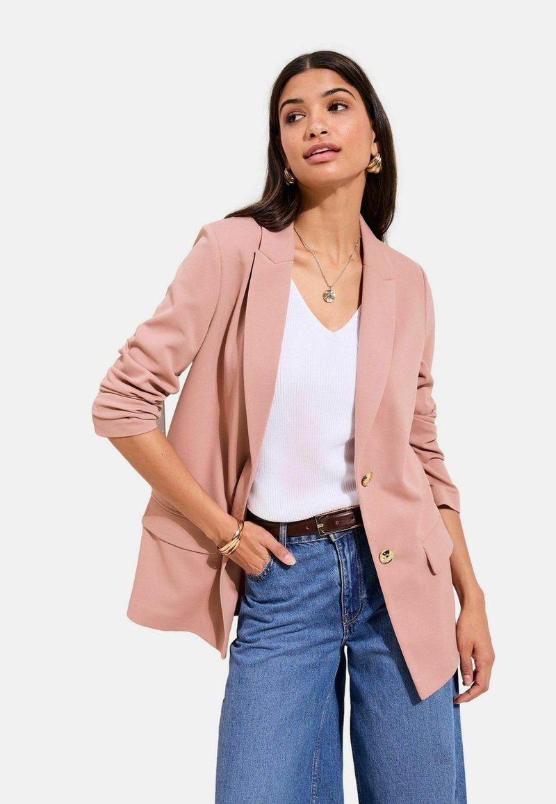 Femme portant un blazer rose clair à manches retroussées sur un haut blanc, associé à un jean large taille haute bleu et des accessoires dorés.