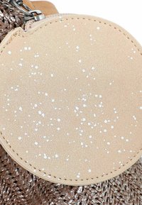 Sac fourre-tout argenté métallique avec fond en cuir beige, petite pochette ronde pailletée beige, et bandoulière amovible marron avec texte en écriture blanche.