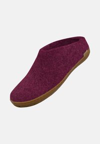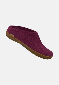 Mule en feutre bordeaux à enfiler, avec bout fermé, dos ouvert et semelle en caoutchouc brun texturé, adaptée pour un usage intérieur ou extérieur.