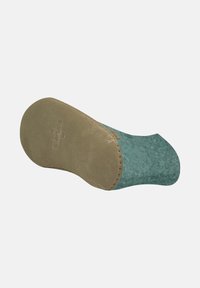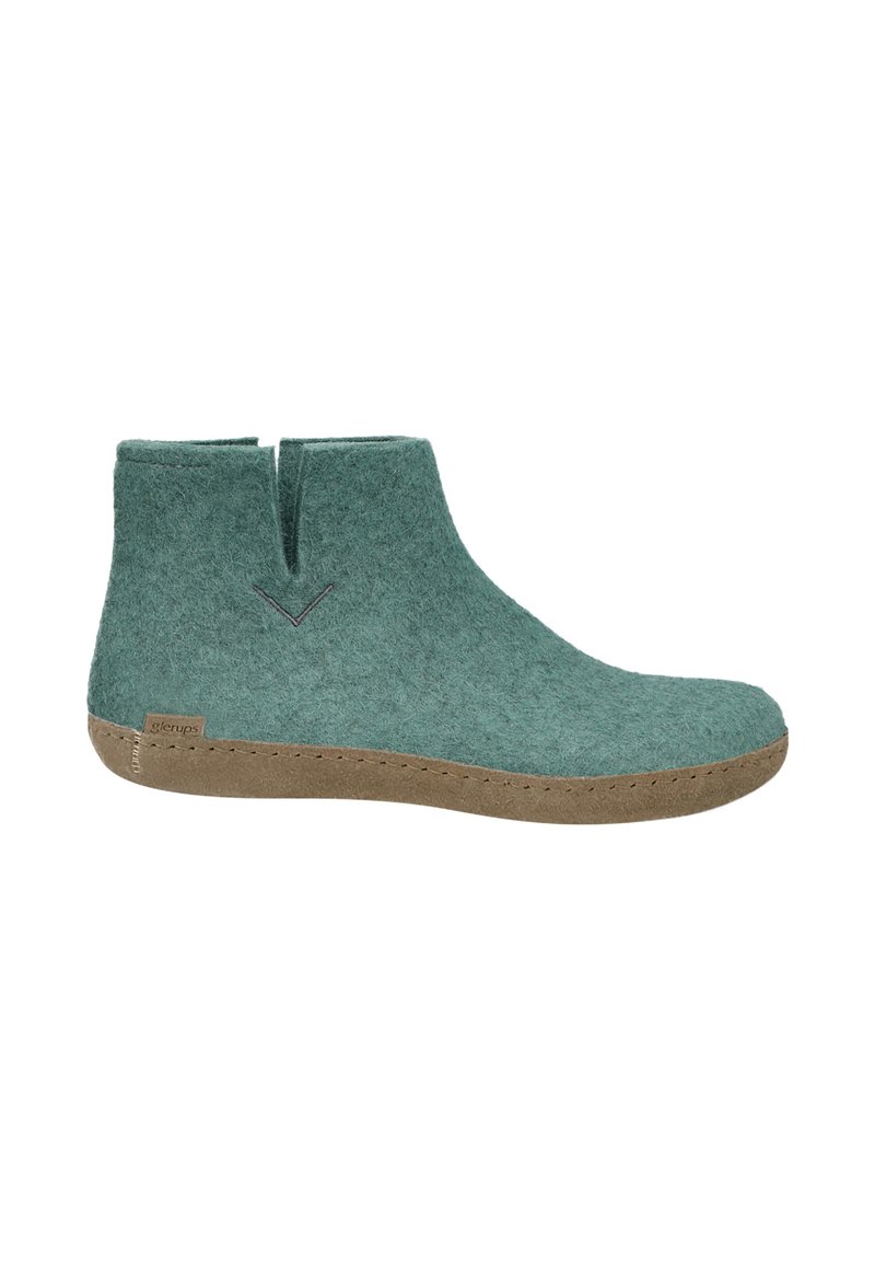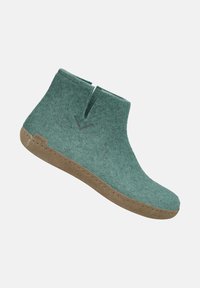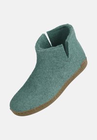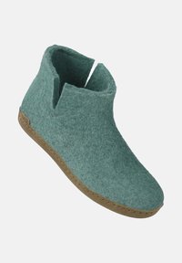 Chausson à cheville en feutre vert avec semelle marron, fente latérale et petite étiquette au talon.
