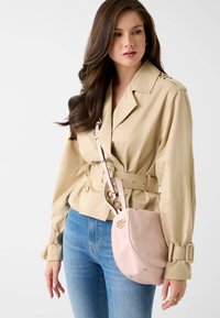 Femme portant une veste beige ceinturée et un jean bleu, portant un sac à bandoulière rose clair avec des accents dorés.