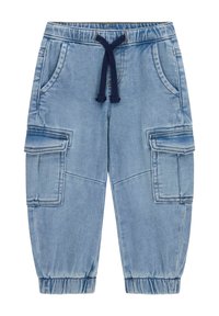Pantalon jogger en denim bleu moyen avec taille à cordon, poignets élastiques et plusieurs poches latérales. Texture lisse et finition délavée.