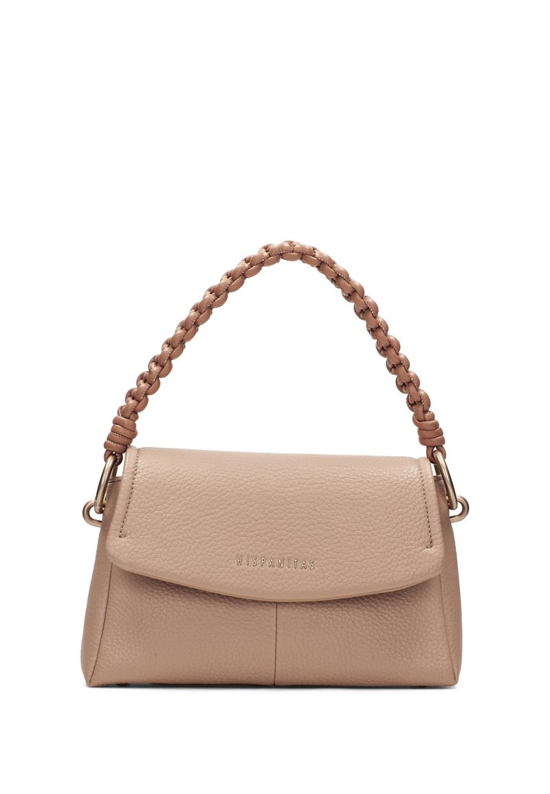 Sac à main en cuir beige avec une anse tressée et une fermeture à rabat, arborant le nom de la marque "Hispanitas" à l'avant.