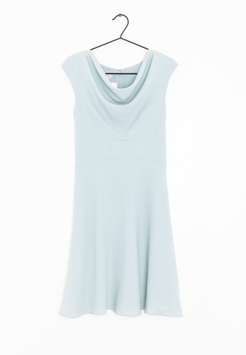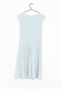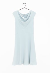 Robe bleu clair sans manches avec un col drapé, suspendue à un cintre noir sur un fond blanc.