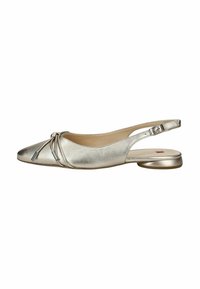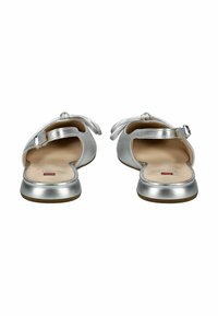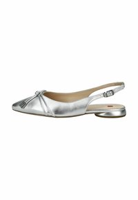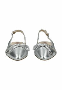 Chaussure plate slingback en cuir argenté avec bout pointu, nœud décoratif à l'avant et bride réglable avec boucle.