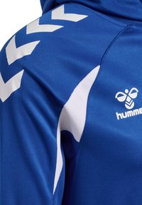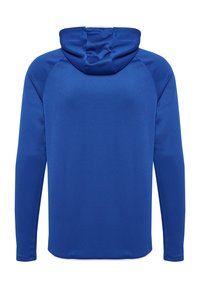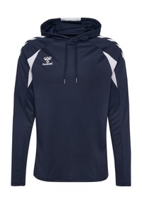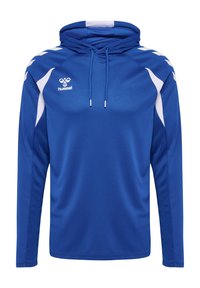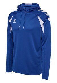 Hoodie de sport bleu à manches longues avec des accents blancs sur les épaules, des cordons et un petit logo blanc Hummel sur la poitrine gauche.