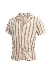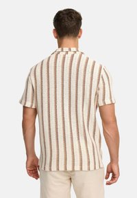 Homme portant une chemise tricotée à manches courtes avec des rayures verticales beige et marron, debout devant un fond clair uni.