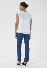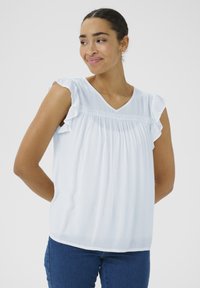 Jeune femme aux cheveux foncés attachés en arrière, portant un chemisier blanc sans manches avec des épaules volantées et des plis délicats, posant devant un fond uni.