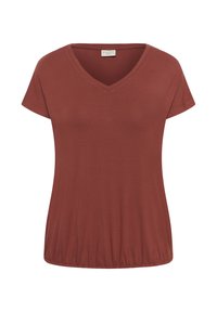 T-shirt noir à col en V avec des manches courtes, en tissu doux ; coupe décontractée avec un ourlet arrondi, associé à un jean en denim bleu.