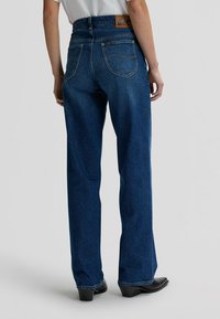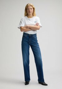 Personne portant un jean bleu foncé taille haute à jambe droite et des bottes noires à bout pointu, debout devant un fond uni gris clair.