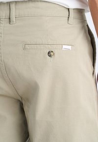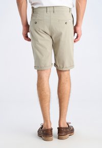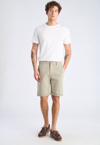 Homme portant un short beige retroussé, une chemise blanche et des chaussures bateau en cuir marron, debout devant un fond clair uni.