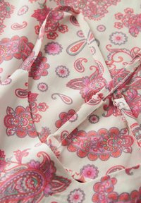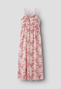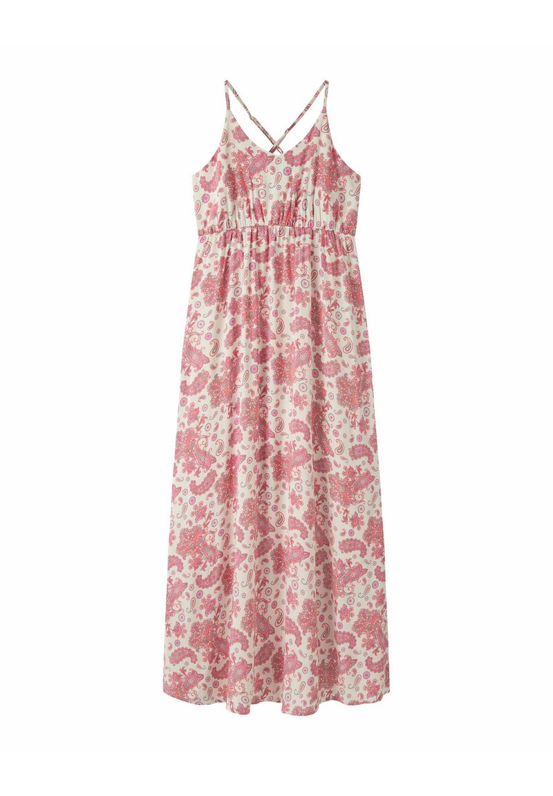 Robe maxi sans manches avec imprimé floral paisley rose, taille élastique et fines bretelles croisées sur tissu beige clair.