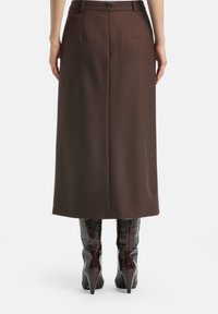 Jupe marron, longueur genou, en tissu structuré, avec un pli sur le devant. Associée à des bottes hautes marron en simili-crocodile.