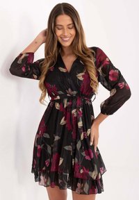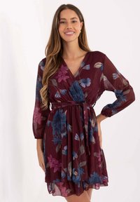 Robe fleurie en tissu transparent, avec un col en V, de longues manches bouffantes, une taille cintrée et une jupe évasée. Principalement beige avec des fleurs bordeaux.