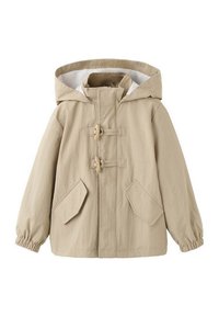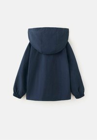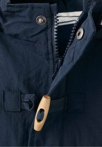 Veste à capuche bleu marine avec doublure intérieure rayée, boutons à bascule en bois, poches frontales inclinées et poignets élastiqués.