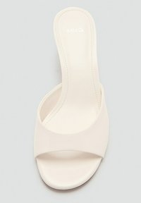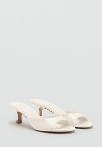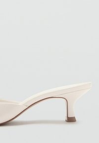 Mule blanche en cuir à bout ouvert avec un petit talon fin et une semelle mince, vue de profil sur un fond blanc.