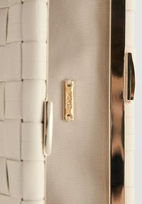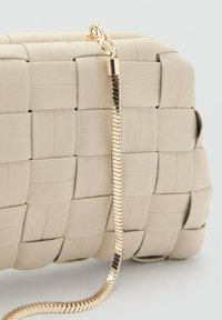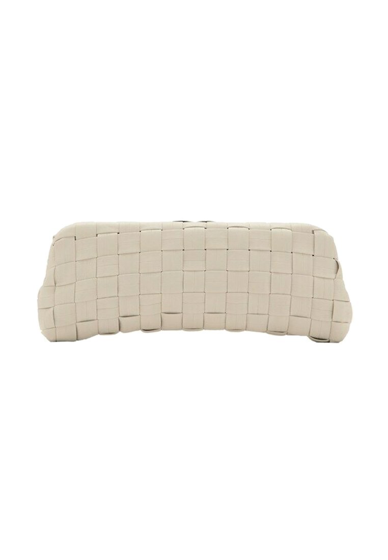 Pochette en cuir tressé beige avec une forme rectangulaire et un bord supérieur légèrement courbé.