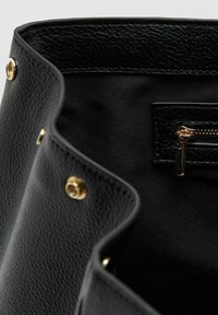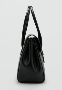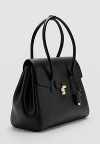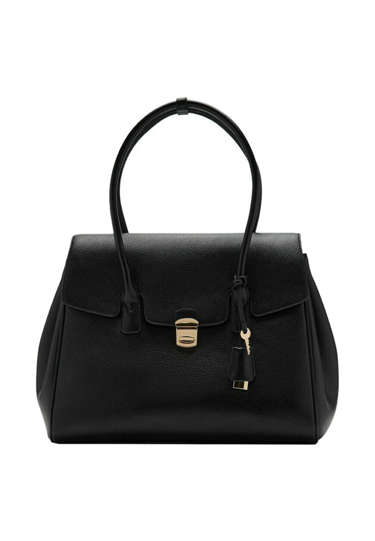 Sac à main en cuir noir avec deux poignées, fermoir à clé doré, et une clé suspendue à une lanière en cuir sur fond blanc.