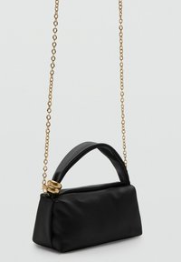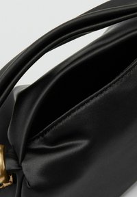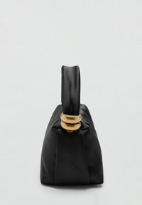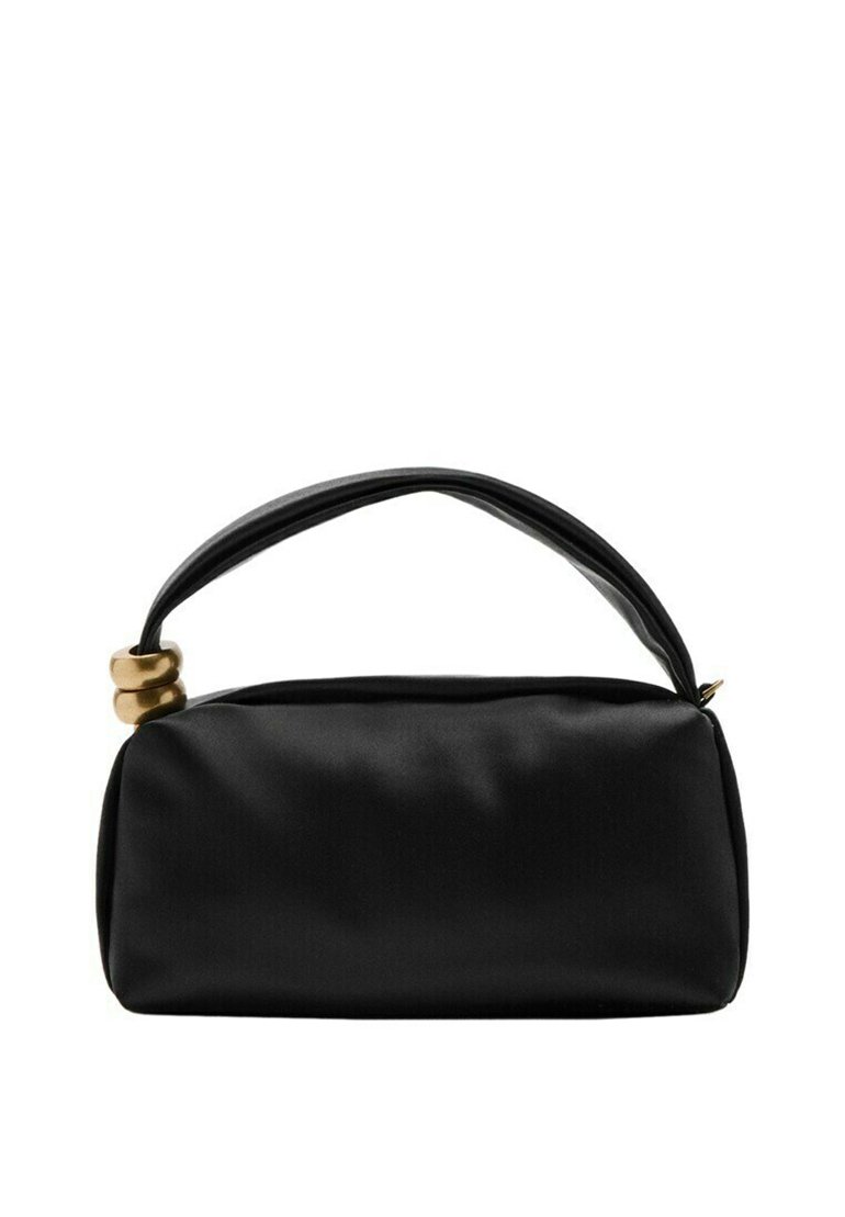 Sac à main rectangulaire noir avec une poignée courte ornée de deux accents en forme d'anneaux dorés sur un côté, sur fond blanc.
