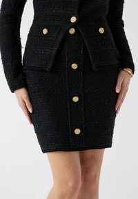Femme portant une jupe noire texturée et une veste assortie avec des boutons dorés, associées à des escarpins noirs à bride cheville, debout sur un sol blanc.