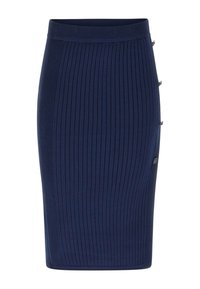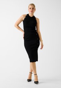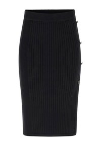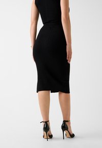 Femme portant une jupe midi côtelée noire avec des boutons latéraux et une fente, associée à des escarpins noirs à bride cheville et un bracelet doré.
